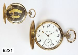 Taschenuhr, J.A.EMOND,MONTREAL, gold filled, verschraubter Deckel und Boden, kleine Sek.auf 6 Uhr, Emaille auf 5 Uhr, beschädigt, Zenith-Werk, Steine durch Metalllager ersetzt, rücks. Gravur "Pferd"