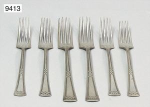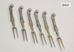 7 gemischte Fleischgabeln, Silber 800/000 ( 4 mit Metallzinken und kitgefüllt ), gesamt ca. 244 g