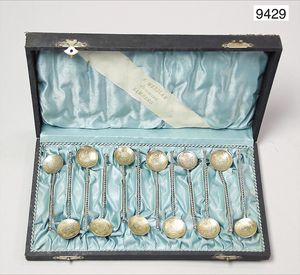 Sammlung alter englischer Kaffeelöffel aus Sterlingsilber mit Golfmotiven, insg. 29 Stück und eine Gabel, erste Hälfte 20 Jhdt., mit englischer Glasvitrine Mahaghoni