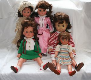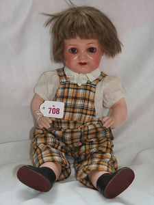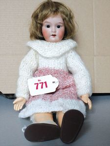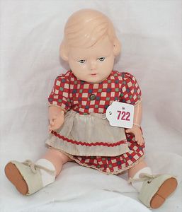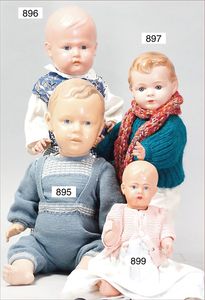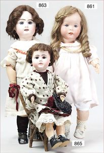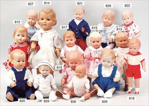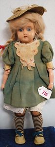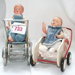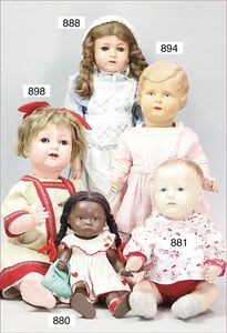 Fundkiste, u.a. Puppenkaffee-Service, Porzellan, Kaffeekanne, Höhe 8 cm, mit 6 Tassen, Untertassen, Milchkännchen und Zuckerdose, Griff an einer Tasse weggebrochen, dazu Suppenterrine, mit Platte, 2 Schüsseln, 2 Teller, 1 Wandkaffee-Mühle, Verschluss fehlt, 1 Blech-Waschtisch, Höhe 14 cm, 3 Celluloid-Püppchen, 1 Masse-Einbindekopf-Vollkopfjunge, modellierte Frisur, gem. 803 und anderes