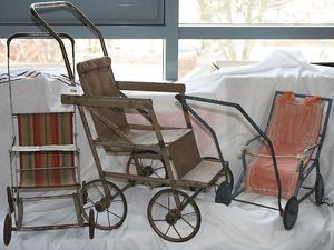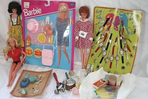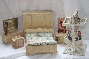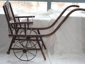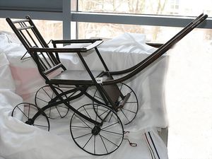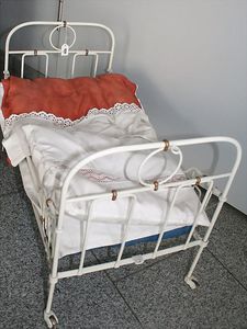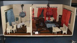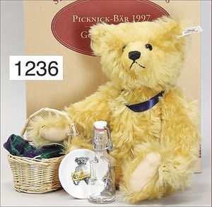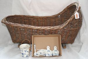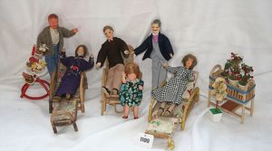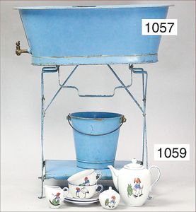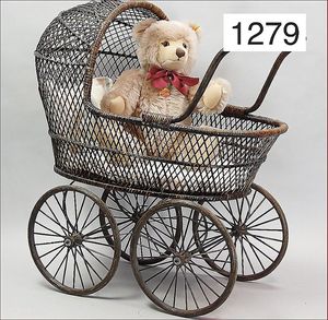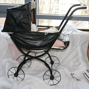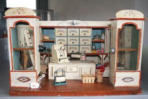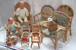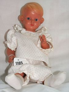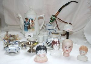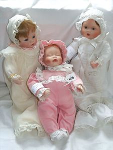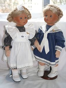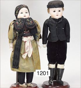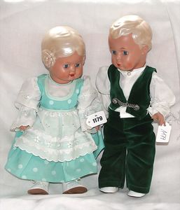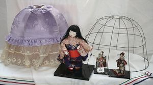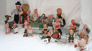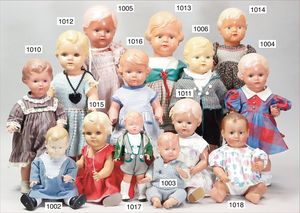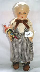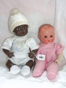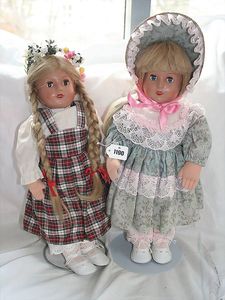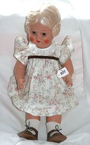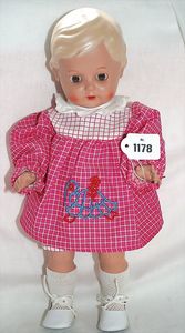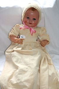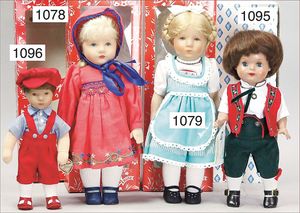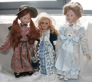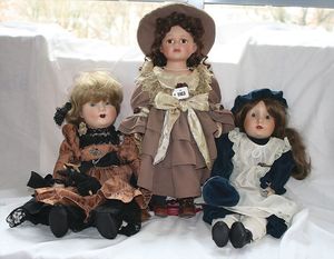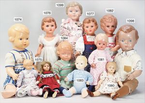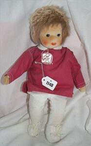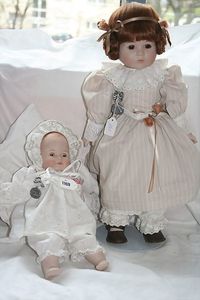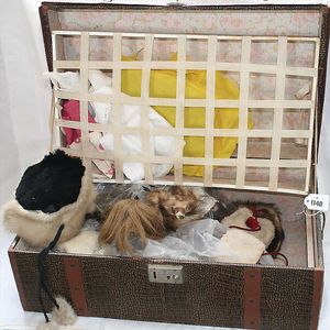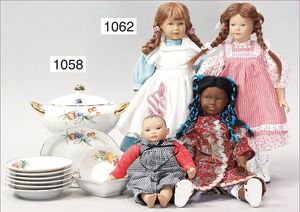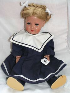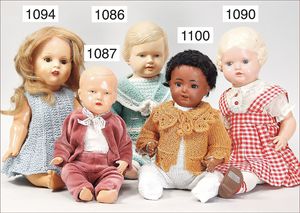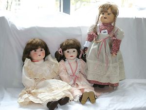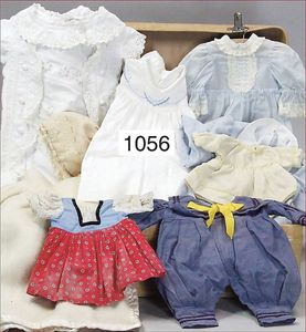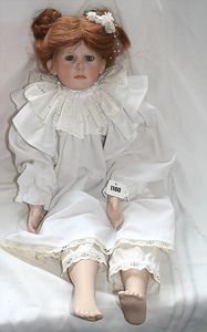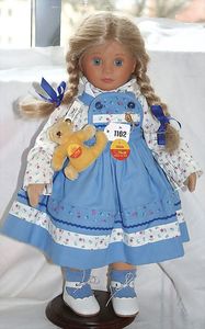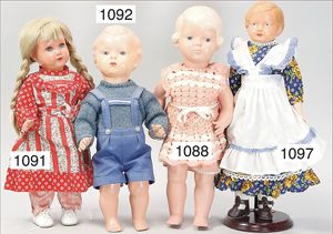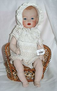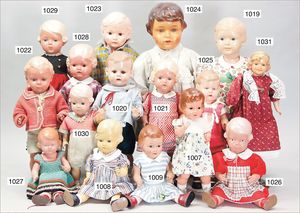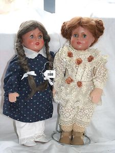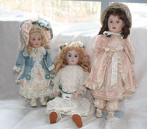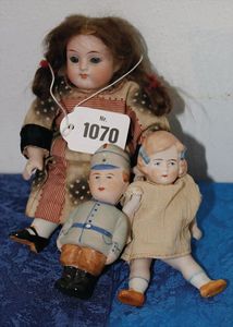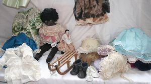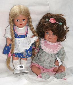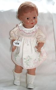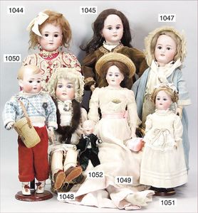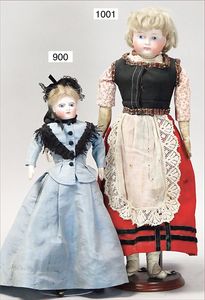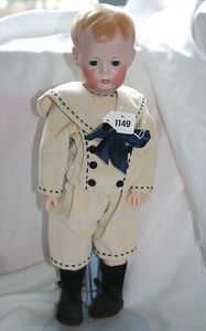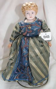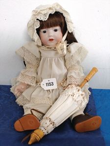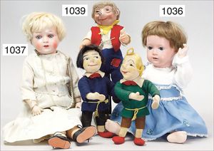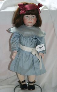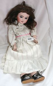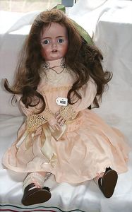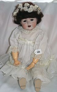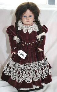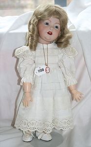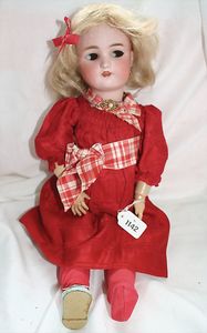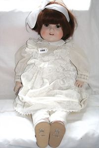 Porzellankopf-Puppe, gem. DEP II, blaue Schlafaugen, off. Mund, Zähne, durchst. Ohren, Korkdeckel fest aufgeklebt, von aussen keine Risse erkennbar, bitte Transportrisiko für den Augenmechanismus beachten, Echthaarperücke, auf Gliederkörper, bespielt, eine Hand überstrichen, 61 cm, Kleidung teilweise alt oder aus alten Stoffen genäht