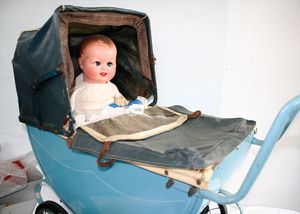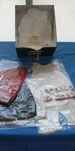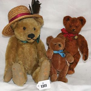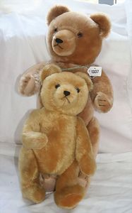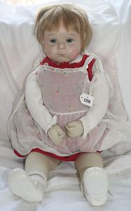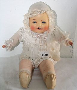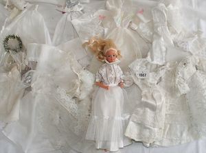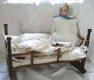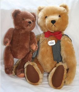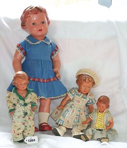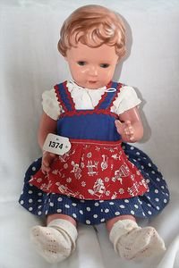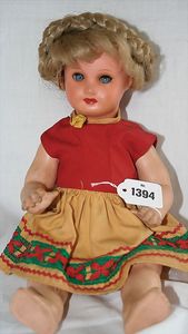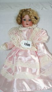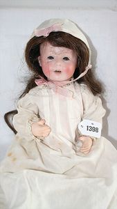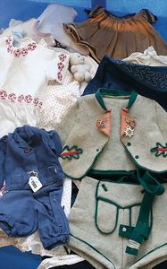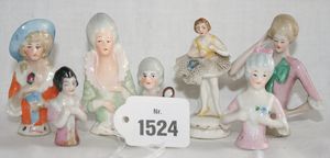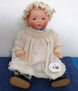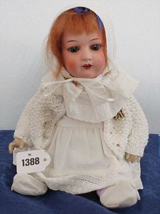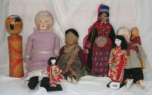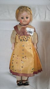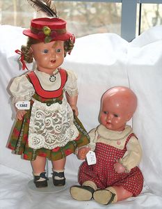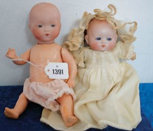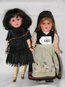2 kl. Porzellankopf-Puppen, 1x gemarkt Armand Marseille 390, blaue fest eingesetzte Glasaugen, off. Mund, Zähne, Kunsthaarperücke, Masse-Stehkörper, mit anmodellierten Schuhen, 23 cm, 1x Heubach Köppelsdorf, gemarkt 407, blaue Schlafaugen, off. Mund, Zähne, etwas Farbabrieb an der Kopfkrone, Masse-Stehkörper, anmodellierte Schuhe und Strümpfe, 21 cm, in Tracht