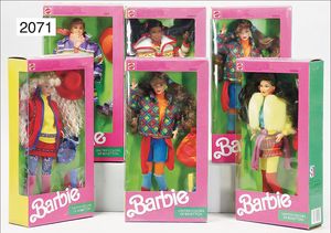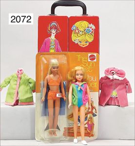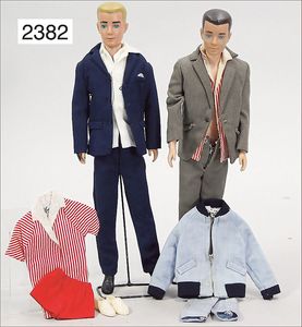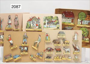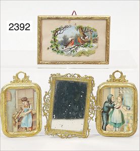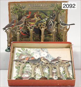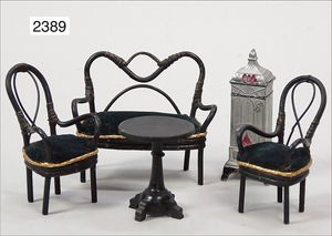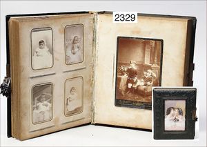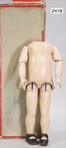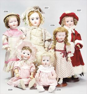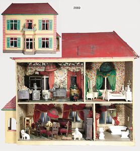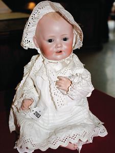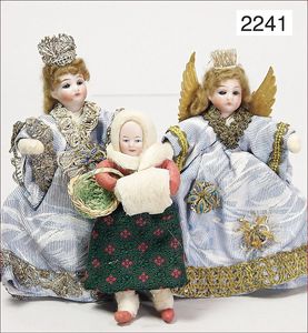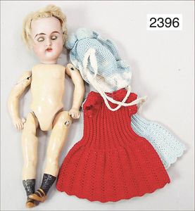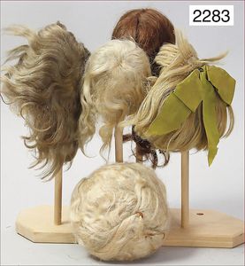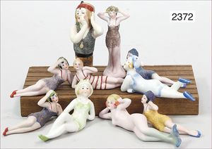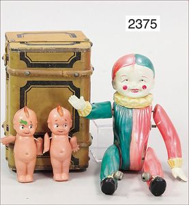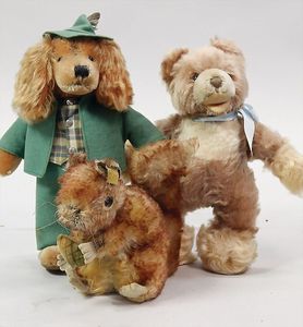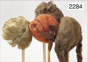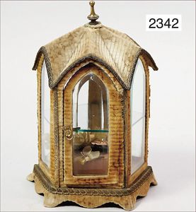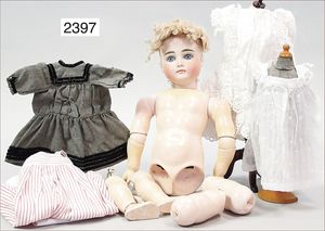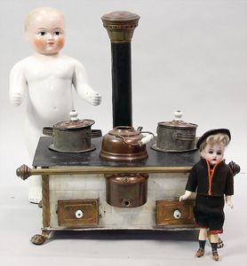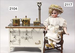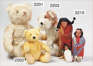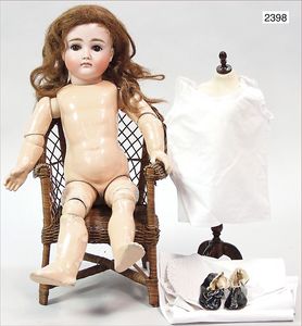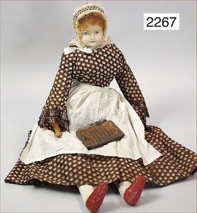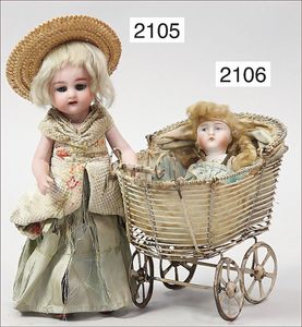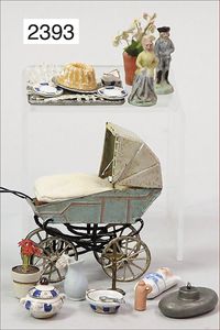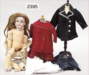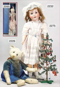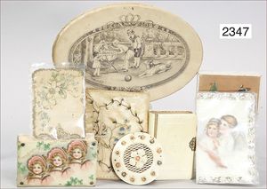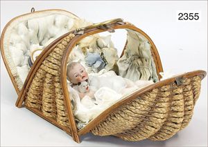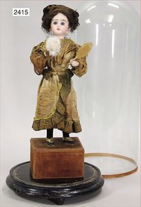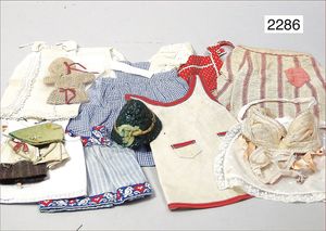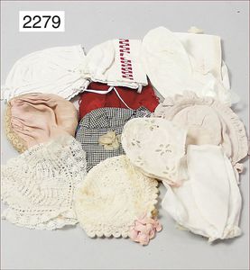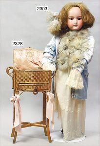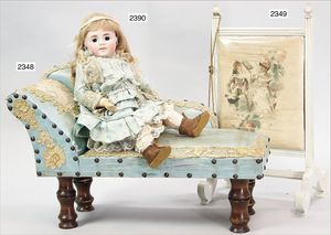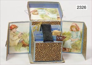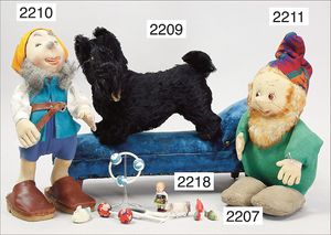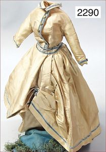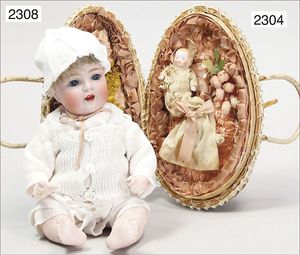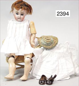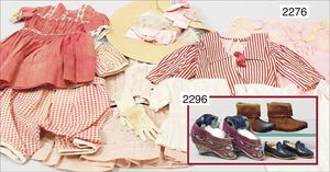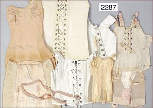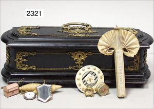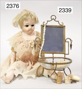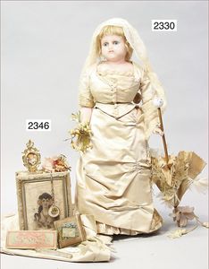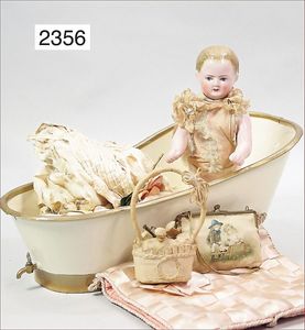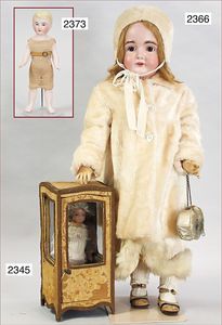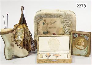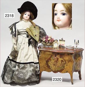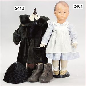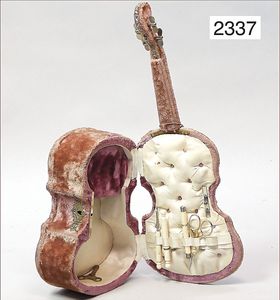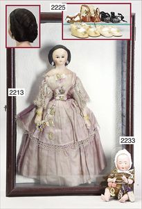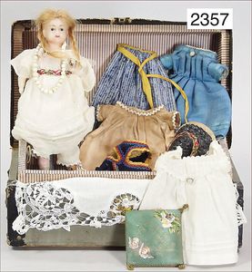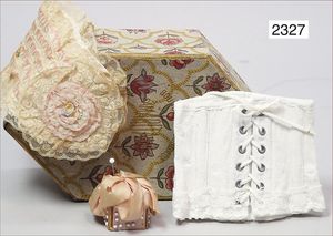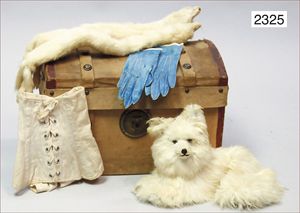 Trousseau-Koffer, Holz, Stoff überzogen, Seiten mit Leder, Nieten, innen Papier, 27 cm lang, 17 cm tief, 19 cm hoch, dazu 1 x Schnürrkorsett für Lady, Durchm. der Hüfte 12 cm, 1 x Nerzschal, 1 x ausgefallene Puppenhandschuhe, für große Lady oder französischer Bébé, himmelblau, Leder, 12 cm lang, 4 cm breit, ausgefallen, 1 x Echtfell-Hund liegend, Glasaugen, 20 cm, scönes Konv.