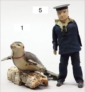 LEHMANN tanzender Matrose, Kopf Blech handlackiert, Blechkörper, Stoffkleidung, Uhrwerk klemmt, 1 Arm fehlt, sonst gut