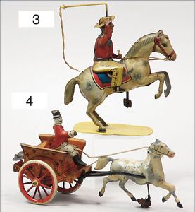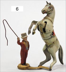 KÖHLER Dompteur mit Zirkuspferd, Blech lithogr., Vorkrieg, Massefigur, Höhe 15 cm, bespielt, guter Zust.