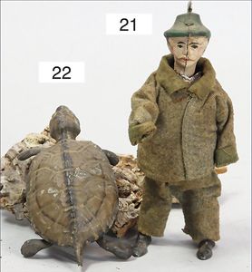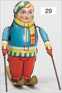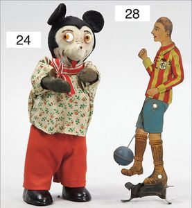 Bayer, Blech handlackiert, 19 cm, ca. 1920, Filzkleidung, Metallguss-Schuhe, Uhrwerk intakt, altersbed. Lackfehler