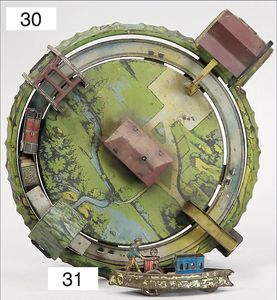 LEVY Tischbahn, Blech lithogr., deutsch, Vorkrieg, Durchm. 25 cm, Uhrwerk intakt, bespielt, altersbed. Lackfehler