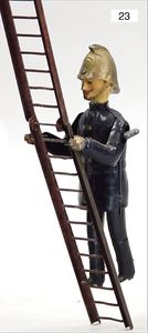 F.N. Feuerwehrmann, Leiter steigend, Blech handlackiert, wohl farbl. etwas ausgebessert, Uhrwerk intakt, hakt manchmal ein wenig, Höhe 21 cm