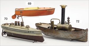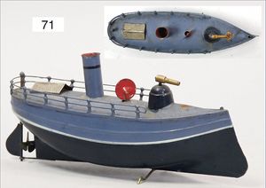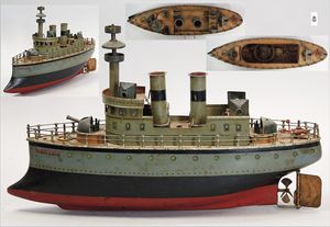 MÄRKLIN Herta, Schlachtschiff, Blech handlackiert, ca. 1910, 52 cm, 2 Schornsteine, 4 Geschütze, 2 Rettungsboote, Kanonen bis auf eine fehlen, Schutzblech an 1 Kanone fehlt, Rettungsboote fehlen, schöner unberührter Orig.-Zust., Dachbodenfund, Federwerk gerissen, Lackierung in schönem Orig.-Zust., mit kl. altersbed. Lackfehlern