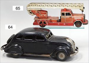 wohl GÜNTHERMANN Feuerwehr, Blech lithogr., Federwerk intakt, Gummibereifung, 2 Fahrerfiguren, 2 Figuren fehlen, Mittelteil Leiter fehlt, bespielt, Lackfehler