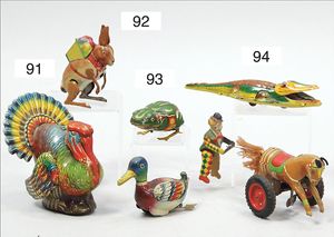 2 Teile Blechspielzeug, Gama, Krokodil, 16,5 cm, Uhrwerk intakt, Feuerstein defekt, 1 Clown mit Pferd, ungem., 17 cm, Uhrwerk intakt, guter Zust.