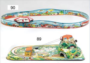 Bahn, Blech lithogr., U.S.-Zone, Durchm. 23 cm, Uhrwerke intakt, guter Zust., im Orig.-Kart., Kart. teilw. verschlissen