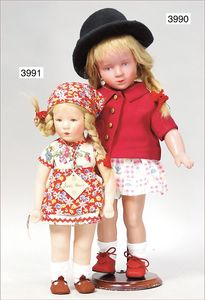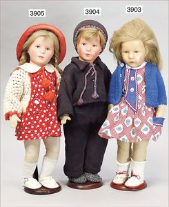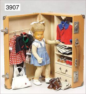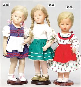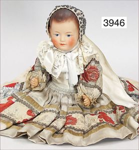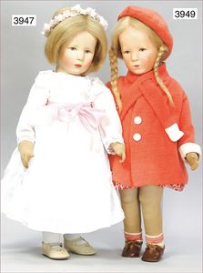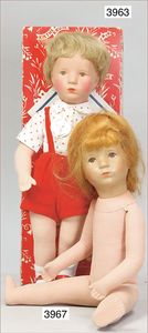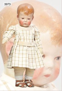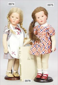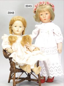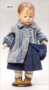 KÄTHE KRUSE Schaufenster-Puppe, Stoffkopf, sichtbare Hinterkopfnaht, 90 cm, schöne Größe, sehr frühe Ausführung, guter Zust., alte Kleidung, Orig.-Perücke, 2 minim. Druckstellen auf der Stirn, 1 minim. Druckstelle unter dem Hals, sowie minim. Abriebstelle auf der Nasenspitze, Körper im gutem Zust., absolut selten