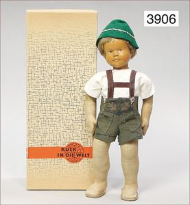 KÄTHE KRUSE Junge, Karlchen, Tortulonkopf, Nr. IV T, braune gemalte Augen, geschl. Mund, Stempel auf der Fußsohle 30. Januar 1961, im Orig.-Kart., unberührt, 35 cm, Orig.-Kleidung, mit Brustschild