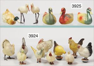 Celluloid-Bauernhoftiere, Vögel, 1 Fasan, Ente, Truthähne, 1 Hahn, teilw. beschwert, schönes Konv.