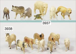 Celluloid, Konv. Wildtiere, 1 x Nashorn, 6 cm lang, 1 x Tiger, 7,5 cm lang, weißer Elefant, 5 cm Länge, 1 x Hyäne, 7 cm lang, Eidechse, 9 cm, 1 Kamel, 3 cm, schönes Konv.
