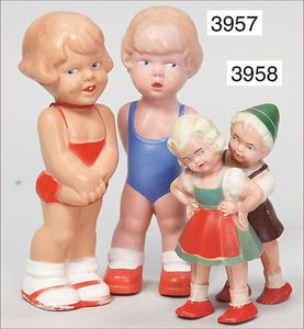 SCHILDKRÖT Celluloid-Pärchen, Rasselpuppen " Mädi", 2 Mädchen im Badeanzug, 15 cm, gem. T 17, Mädchen mit blauem Badeanzug, Bein farbl. etwas ausgebessert