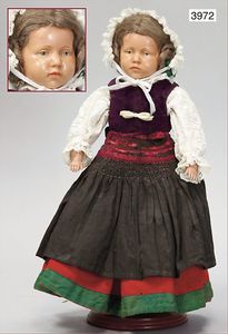 CELLBA Gretchen, mit Affenschaukel, 46 cm, Kurbelkopf, blaue fest eingesetzte Glasaugen, ausmodellierte Haare, Masse-Stehkörper, alte Kleidung, alte Schuhe u. Strümpfe, minim. Farbabrieb auf der Nasenspitze
