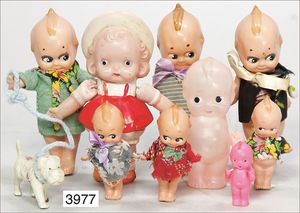 8 Teile Celluloid-Kewpies, 3,5 cm - 9,5 cm, 1 Kewpie beschädigt, dazu Celluloid-Mädchen, Japan, 1 Celluloid-Hund