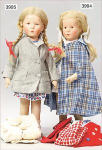 KÄTHE KRUSE deutsches Kind, Ilsebill, 52 cm, Stoffkopf, deutlich sichtbare Hinterkopfnaht, leicht eingeknickte Beine, in den Kniekehlen abgenäht, Augenbrauen etwas abgegriffen, sonst schöner Orig.-Zust., alte Kleidung u. Schuhe, dazu 1 Mantel mit Haube