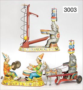 3 Teile Blech-Spielzeug, 2 x Elefant, gem. Made in U.S.-Zone, 1 x mit Ball, 1 x mit Zebra, Uhrwerk intakt, 1 Teil am Karussell fehlt, 1 x musizierende Clowns, gem. EHN Trade Mark