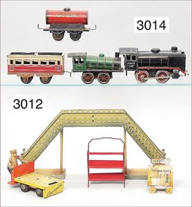 Konv. 4 Teile Eisenbahn-Zubehör, Blech, stärker bespielt, altersbed. Lackabplatzer u. fehlende Kleinteile Zeitungswagen, Kofferfahrer, Figur Celluloid, kl. Druckstelle an der Mütze, Regal, 1 Übergang, Länge 40 cm