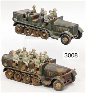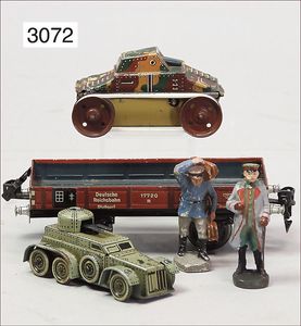 2 kl. Blechpanzer, Uhrwerk intakt, 1 x gemarkt Foreign, 1 x gemarkt D.R.G.M., ca. 10 cm, dazu 1 Märklin Güterwagen, nr. 17720, 2 Elastolin Figuren, 1 x Kofferträger, 1 x Typ Bismarck, bespielt