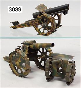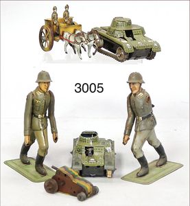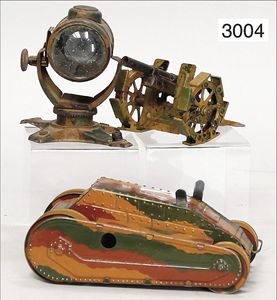 Konv. Blech-Spielzeug, 2 Tanks, gem. Made in Western Germany, Uhrwerk defekt, 1 Kanone lose, 10 cm, dazu 1 x 2-Späher, Fuhrwerk mit Soldaten, 1 Bein weggebrochen, kl. Tank, 6 cm, Uhrwerk intakt, 2 Blech-Soldaten, gem. Made in Germany, Kleinteile fehlen, Höhe 14 cm