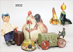 Konv. Blech-Spielzeug, 1 x Traktor mit Fahrer, altersbed. Farbabrieb, Uhrwerk intakt, Länge 11 cm, 2 x Lehmann, Figuren, 3 x Made in China, Kofferträger, Uhrwerk intakt, Schildkröte, 1 Huhn, batteriebetrieben, auf Funktion nicht überprüft