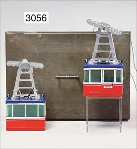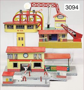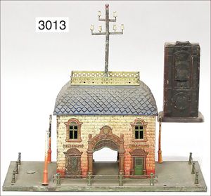 BING 2 Teile Blech, 1 x Bahnhof, Grundplatte 38 cm x 16 cm, Höhe ca. 22 cm, Kleinteile fehlen bzw. weggebrochen, dazu 1 Kartenautomat, Aufschrift "Bahnsteig Karten", Höhe 16 cm