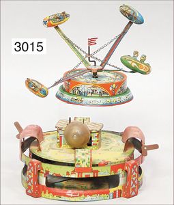 2 Teile Blech-Spielzeug, 1 x Blechbahn, ungem., Uhrwerk intakt, 1 x Karussell, gemarkt Made in Western Germany, Uhrwerk intakt