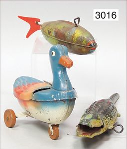 3 teile Blech-Spielzeug, Krokodil, 38 cm, Figur fehlt, Fisch, Länge 21 cm, altersbed. Roststellen, Uhrwerk intakt, 1 Blech-Ente, zum Nachziehen, Hersteller?, altersbed. Farbabplatzer, Gefieder zum Öffnen, Länge 18 cm