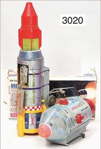 2 Teile Blech-Spielzeug, Made in Japan, Apollo 15 Rakete, 45 cm, Apollo Z Kapsel, Länge 30 cm, kl. Bruchstelle im Plastik, alles bespielt