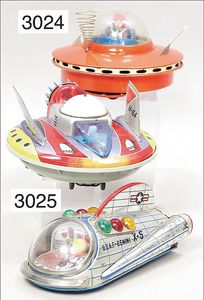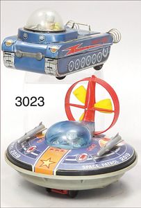2 x Blech-Spielzeug, Raumfahrzeuge, Made in Japan, Space tank, 19 cm, Raumschiff Space patrol 2019, Druchm. ca. 20 cm, alles batteriebetrieben, auf Funktion nicht überprüft, bespielt