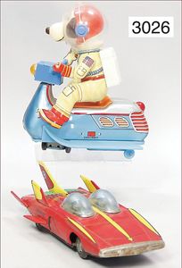 2 x Blech-Spielzeug, Raumfahrzeuge Made in Japan, Firebird, Länge 28 cm, 1 x Spce scooter mit Snoopy, 21 cm, 1 Lasche am Batteriefach weggebrochen, alles bespielt