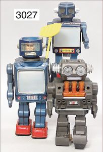 3 Roboter, Made in Japan, 2 x Blech, 1 x Kunststoff, Höhe 24 cm, 25 cm u. 30 cm, batteriebetrieben, auf Funktion nicht überprüft, stärker bespielt, wohl einige Kleinteile fehlen, bzw. weggebrochen