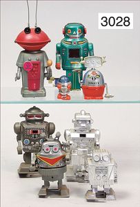 Konv. 8 Roboter, Kunststoff u. Blech, wohl alles Made in Japan, Uhrwerke intakt, 2 x mit Feuerstein, zw. 5 cm u. 14 cm