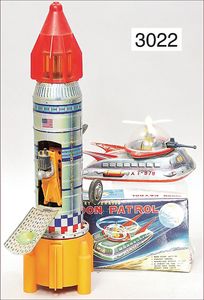 2 x Blech-Spielzeug, Made in Japan, Rakete, 46 cm, 1 x Raumfahrzeug, 19 cm, batteriebetrieben, auf Funktion nicht überprüft, etwas Rost am Mobil