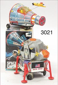 2 Teile Blech-Spielzeug, Made in Japan, 1 x Raumkapsel mit Astronaut, Länge 15 cm, 1 x NASA Apollo Lunamobil, Höhe 16,5 cm, alles batteriebetrieben, auf Funktion nicht überprüft, bespielt