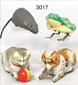 4 Blechtiere zum Aufziehen, Uhrwerk intakt, Köhler Katze u. Hund, Ball fehlt, kl. Schuco Maus, 1 x Frosch, Hersteller?