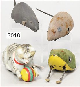 Konv. 4 Blechtiere, zum Aufziehen, 1 x Köhler Katze, 2x Schuco Maus,Uhrwerk defekt,samtbezogen, Frosch v. Inco, Uhrwerke intakt,