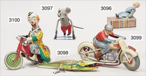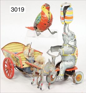 3 Teile Blech-Spielzeug, 1 x Karre mit Esel, gemarkt Made in Western Germany, 1 x Vogel, gemarkt WFZ, Made in Germany U.S.-Zone, 1 x Elefant, Made in U.S.-Zone, wohl Nachbau, Uhrwerke intakt