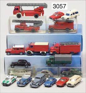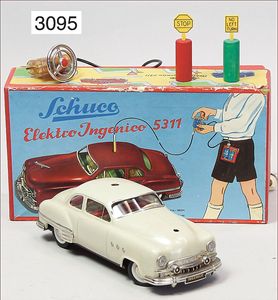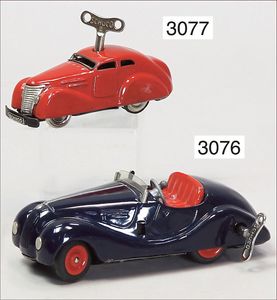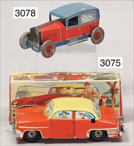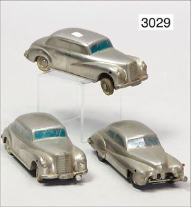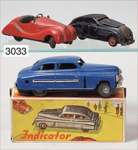 Konv. 3 Modell-Fahrzeuge, Blech, 1 x gemarkt JNF, Indikator, 2 x Schuco, 1 x Commando anno 2000, 1 x Acustico 2002, alles stärker bespielt, 1 Frontscheibe fehlt, Uhrwerk eintakt