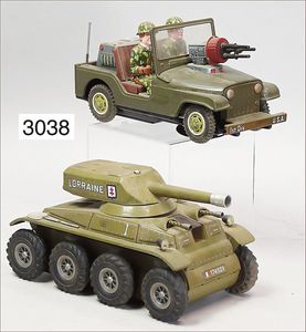 2 Militärfahrzeuge, 1 x Jeep, batteriebetrieben, Made in Japan, 28 cm, auf Funktion nicht überprüft, 1 x Tank, gemarkt Joustra, Made in France, Uhrwerk intakt