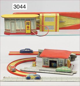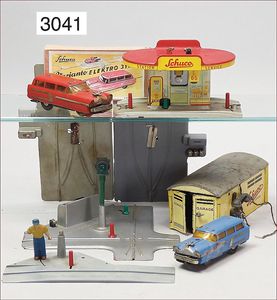 2 Blech-Bahnen, nicht komplett, Made in Germany, mit 5 Fahrzeugen, Uhrwerk defekt, dazu 1 Distler Tankstelle
