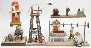 Konv. Dampfmaschinenantriebsmodelle, Windmühle, Hammerwerk, Motor, Mann am Schleifstein, nicht komplett, Transmission, Förderturm Höhe 28 cm, 1 Dampfmaschine auf Holzsockel, Teile lose (Ersatzteilspender)