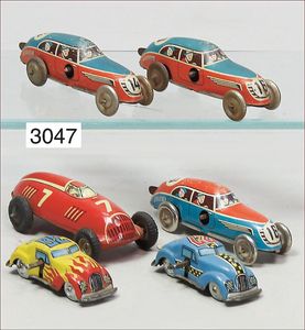 3 Blechfahrzeuge, davon 2 x Schuco, Examico 4001, 1010, dazu Audi, Rennwagen, Uhrwerke intakt, altersbed. Farbabrieb, stärker bespielt