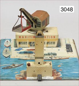 Blech-Spielzeug, Hafen mit Kran, Uhrwerk intakt, auf Vollständigkeit nicht überprüft, altersbed. kl. Roststellen