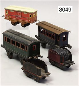 Konv. 3 Eisenbahnwaggons u. 2 Tender, 2 x Märklin Personenwagen, Spur 1, altersbed. Farbabplatzer, kl. Roststellen u. Verformungen, dazu 2 Tender, 1 Gepäckwagen, Blech, gemarkt Made in Germany