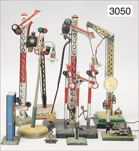 6 Signale, 2 Laternen, 1 Richtungsanzeiger, u. anderes, versch. Hersteller, passend zu Spur 0 u. 1, Blech lithogr., alles bespielt